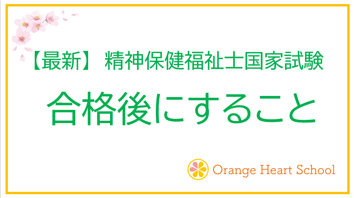ARCHIVES 2026年2月 【受験を迷っている方へ】受験するメリットを分かりやすく解説します。 2026.02.03 ケアマネジャー試験対策 オレンジハートスクール 福祉系資格のオレンジハートスクール 【最新】精神保健福祉士国家試験 合格後にすることを分かりやすく解説します。 2026.02.02 精神保健福祉士試験対策 オレンジハートスクール 福祉系資格のオレンジハートスクール 【最新】社会福祉士国家試験 合格後にすることを分かりやすく解説します。 2026.02.02 社会福祉士試験対策 オレンジハートスクール 福祉系資格のオレンジハートスクール