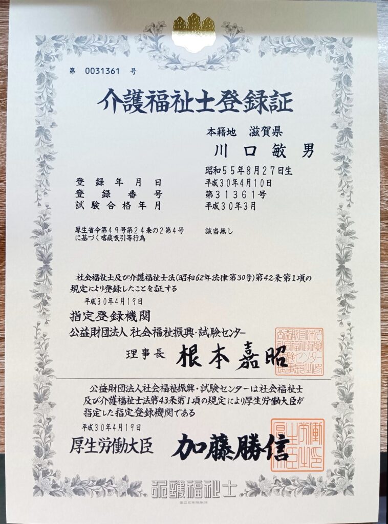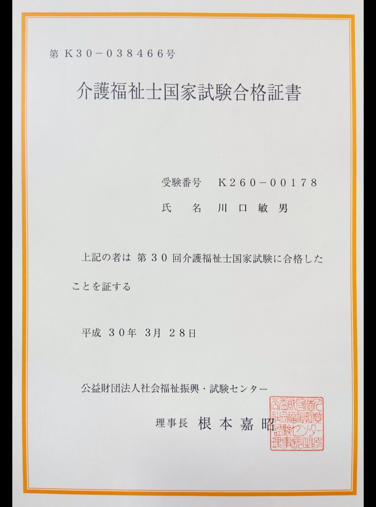 これで、「社会福祉士」、「精神保健福祉士」、「ケアマネジャー」、「介護福祉士」という代表的な福祉の国家資格等を手に入れた瞬間でした。