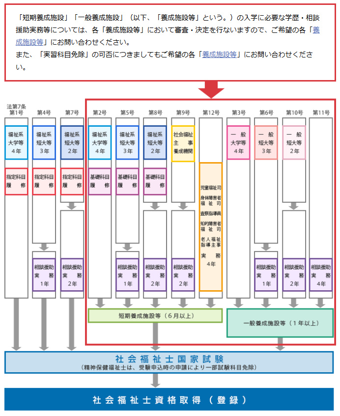 社会福祉士の受験資格を取得するためには、決められたルートを経て受験資格を満たす必要があります。(下記のルート図参照)